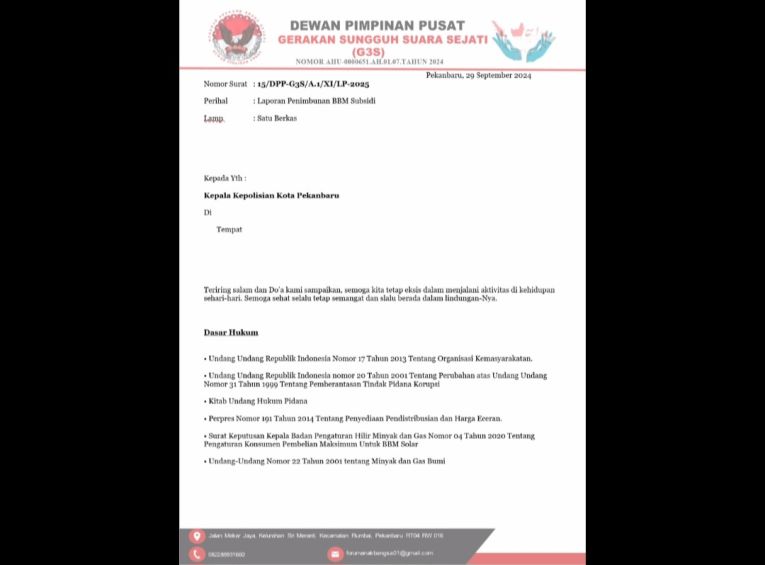 “Jika dibiarkan kegiatan ini tentu membuat negara rugi. Gudang BBM milik saudara Leman ini resmi kami laporkan ke Polresta Kota Pekanbaru," ucap Ketua harian organisasi Gerakan Sungguh Suara Sejati (G3S) itu, Senin (29/10/2025).